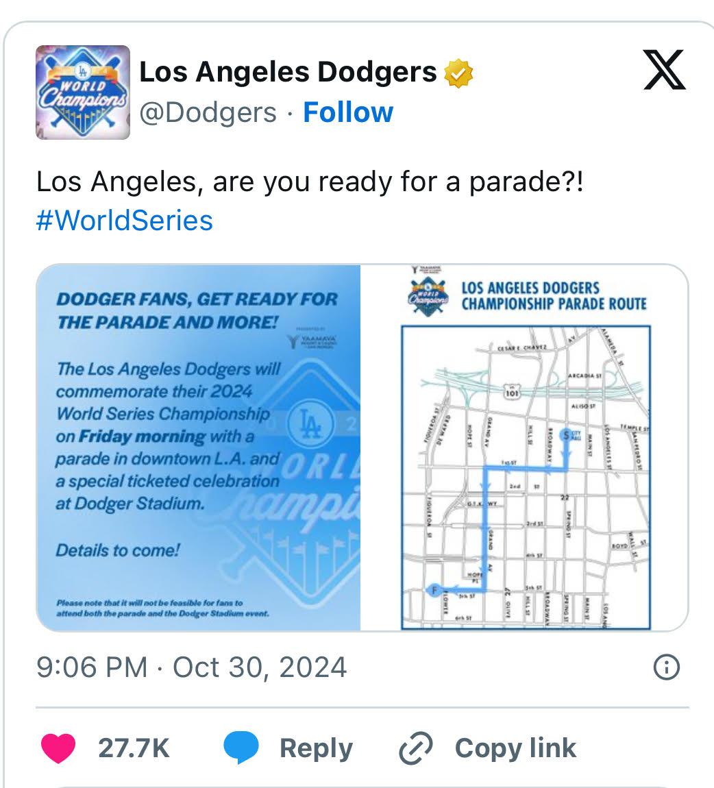 Los Angeles Dodgers Set to Celebrate 8th World Series Title with Parade Honoring Fernando ValenzuelaThe Los Angeles Dodgers are preparing to celebrate their latest World Series title with a grand parade through downtown Los Angeles on Friday, Nov. 1. This historic victory marks the Dodgers’ 8th championship and will be commemorated with festivities beginning at 11 a.m. at Gloria Molina Grand Park. Mayor Karen Bass will launch the event, with Dodgers players traveling along 1st Street, down S. Grand Avenue, and concluding at 5th and Flower Street on double-decker buses. This year’s parade holds special significance as it coincides with what would have been the 64th birthday of Dodgers legend Fernando Valenzuela, who recently passed away on October 22. Valenzuela, whose 1981 rookie season sparked “Fernandomania,” remained a cherished part of the Dodgers organization well beyond his playing years. After retiring, he rejoined the Dodgers as a Spanish-language broadcaster, serving from 2003 to 2024, the year of his death. His legacy has deeply impacted both the franchise and fans across Los Angeles, making this celebration a fitting tribute. Fans are encouraged to take public transportation due to expected street closures and limited parking. The 45-minute parade will be followed by a special ticketed event at Dodger Stadium at 12:15 p.m., with gates opening early at 8:30 a.m. The Dodgers invite the community to come together for a day of celebration, not only to honor this year’s team but also to remember Valenzuela’s lasting contributions to the Dodgers and baseball history.