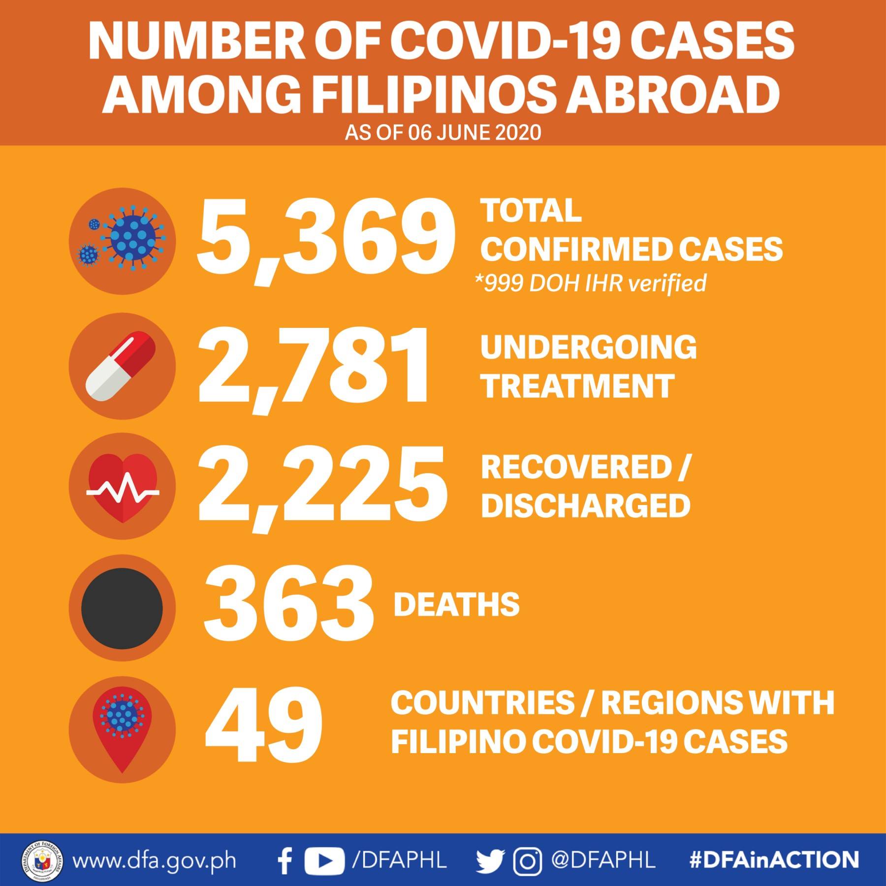 The DFA also reported eight new COVID-19 cases among overseas Filipinos, bringing the total number of infected individuals to 5,369.