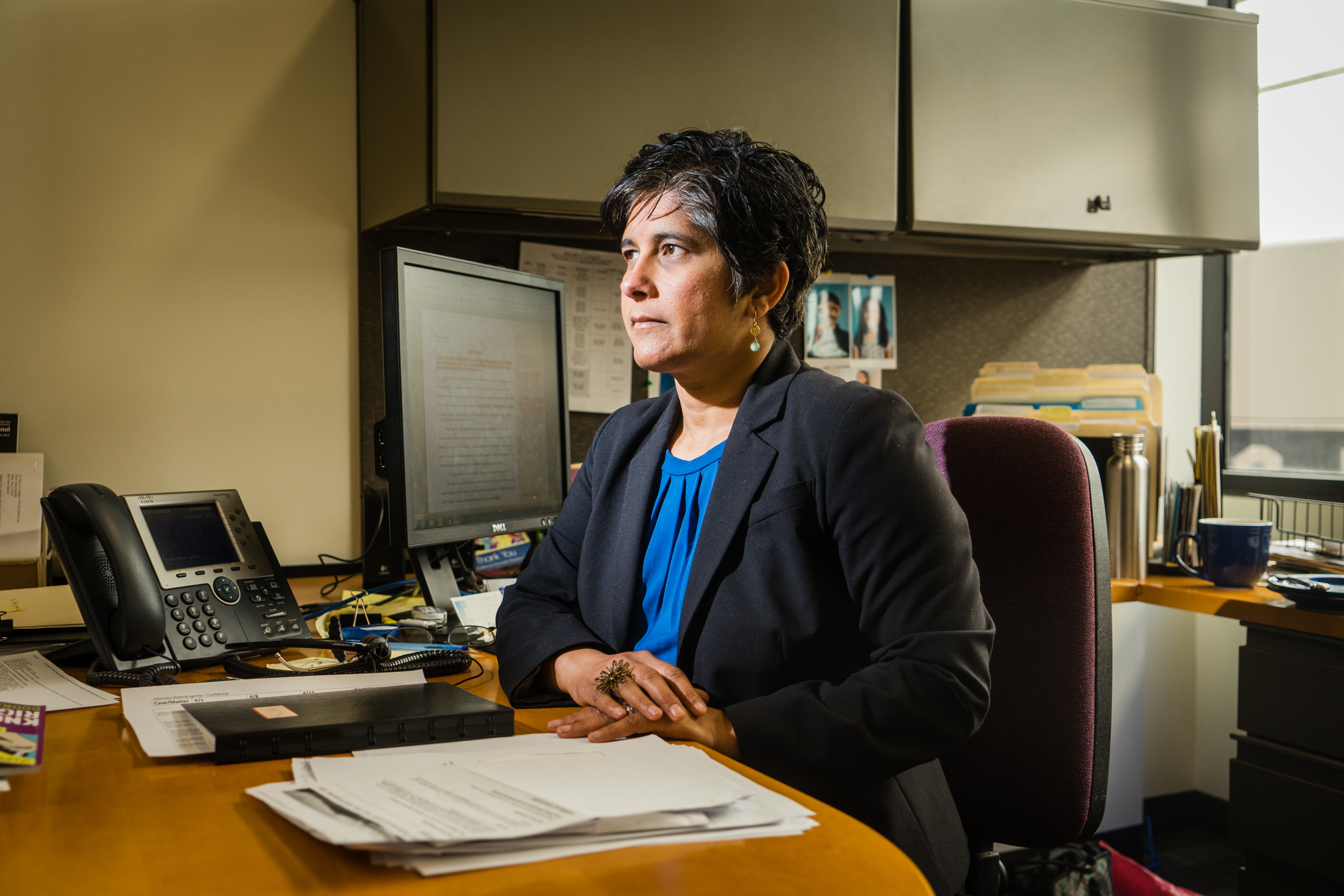 Dr. Hina Shah poses for a photograph at Golden Gate University where she is a professor and the director of the Women’s Employment Rights Clinic. | Photo by: James Tensuan for Reveal