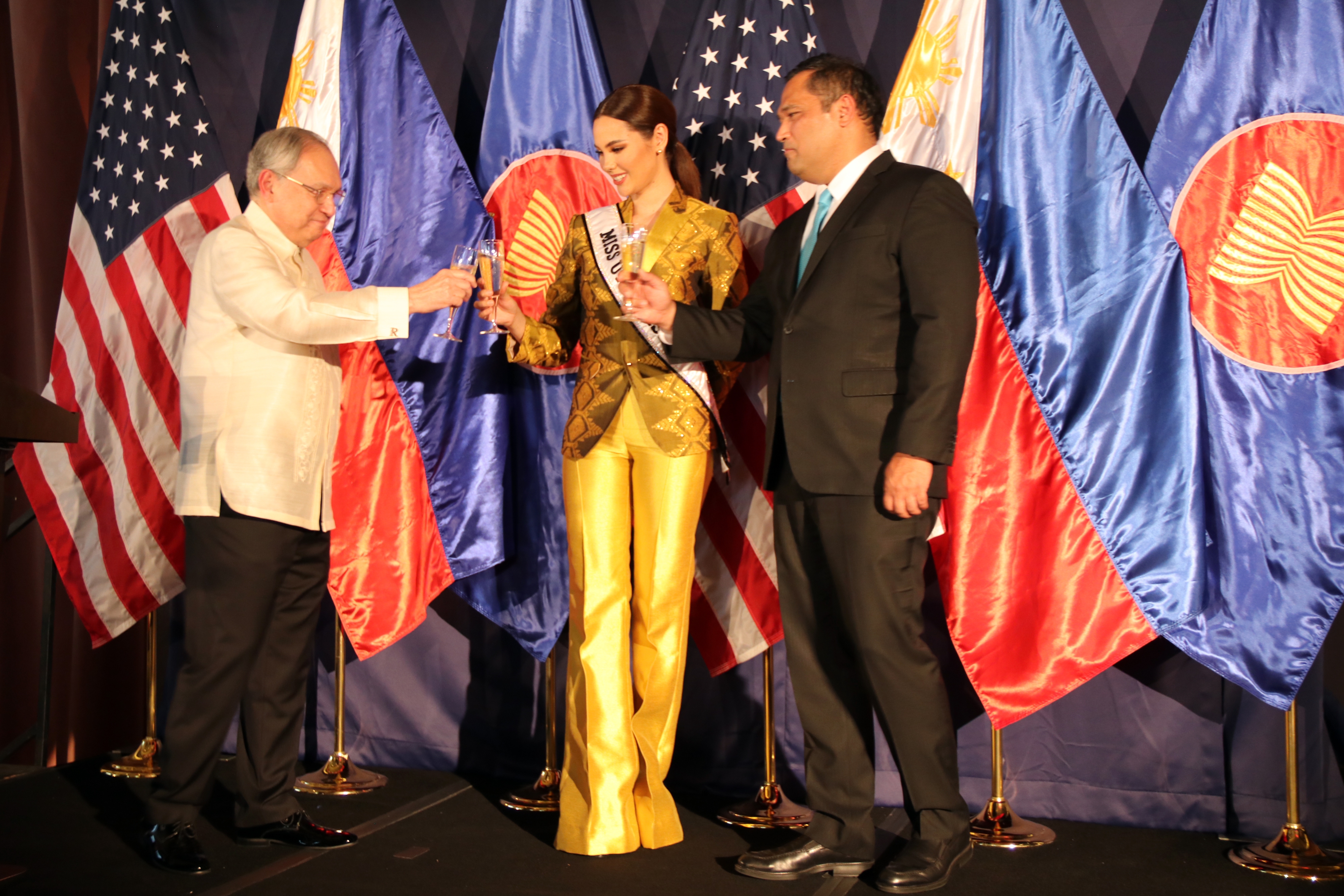 Philippine Ambassador to the United States Jose Manuel G. Romualdez, US State Department Undersecretary for Management Brian Bulatao, and Miss Universe 2018 Catriona Gray toast to the longstanding friendship between the Philippines and the United States at the Diplomatic Reception commemorating the 121st anniversary of the proclamation of Philippine Independence at Roof Terrace Restaurant of The John F. Kennedy Center for the Performing Arts on Monday, June 17.