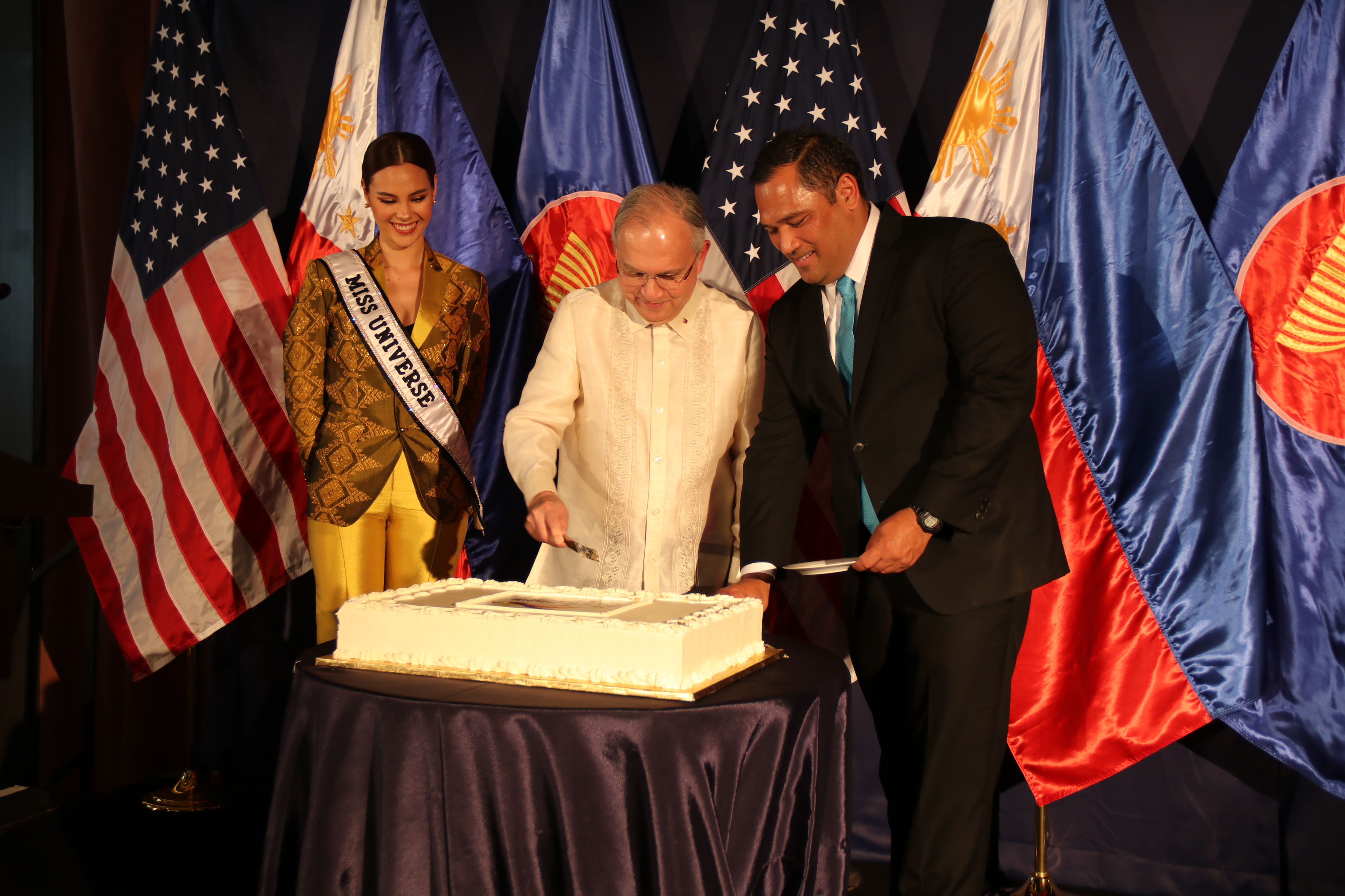 Miss Universe Catriona Gray, Ambassador Jose Romualdez, and US State Department Undersecretary for Management Brian Bulatao lead the ceremonial cutting of the cake to celebrate Philippine independence.